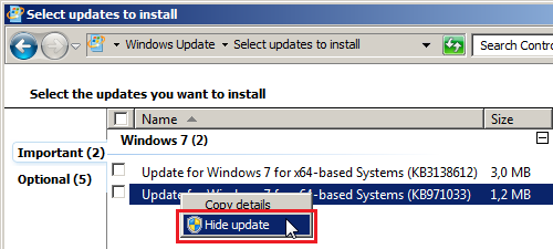 Open the Control Panel and navigate to System and Security > Windows Update > Check for Updates and hide all the updates listed here, both under Important and Optional.