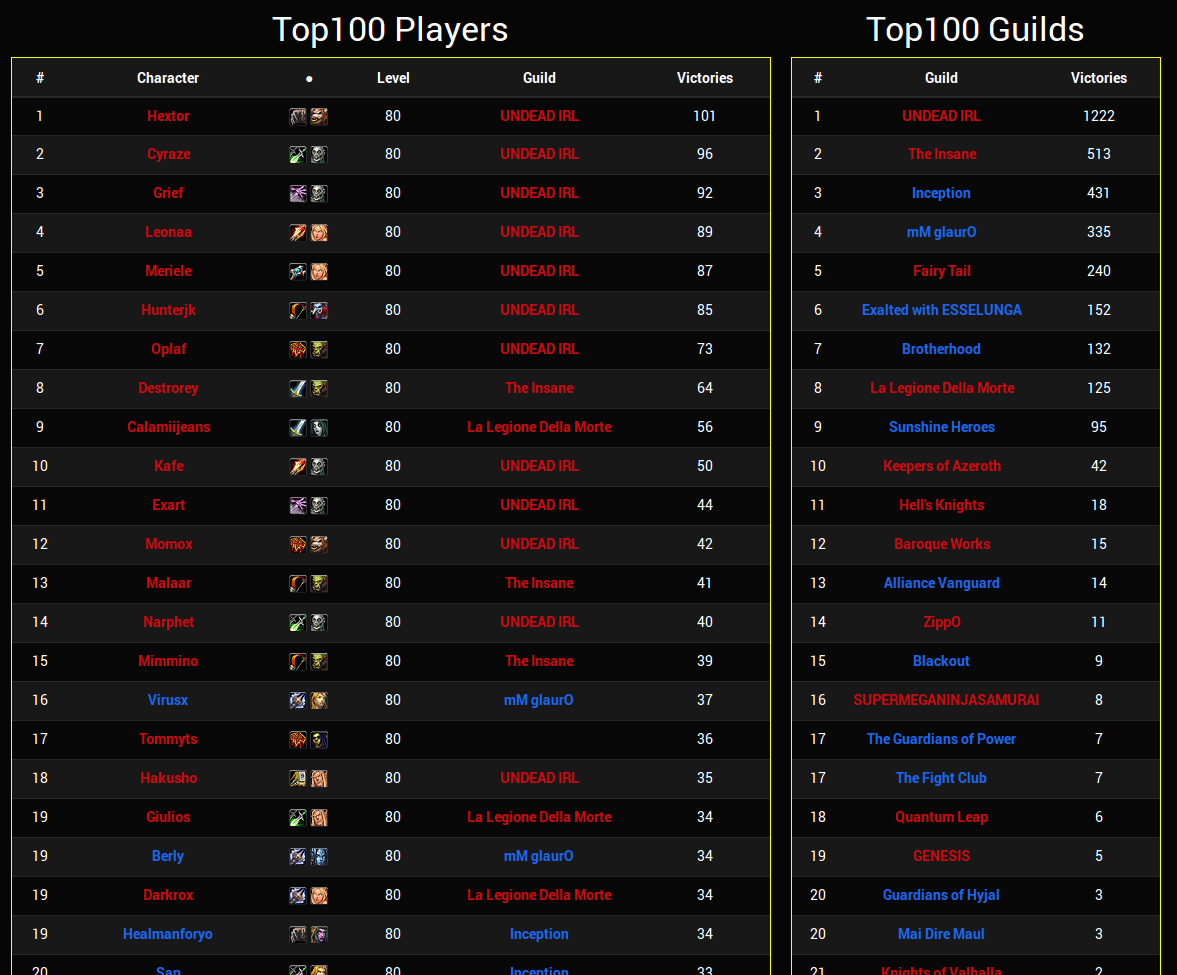 The web application currently displays the amount of victories of factions, top 20 players and top 5 guilds of:
