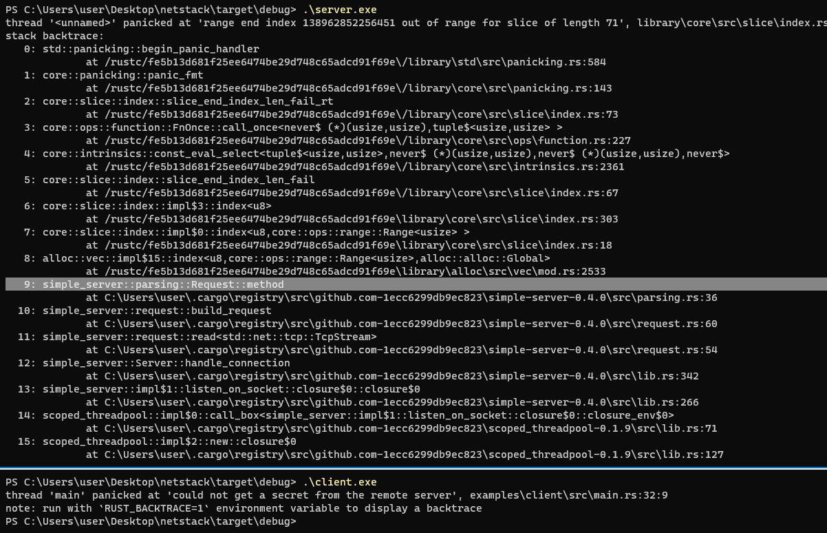 In dependency `simple_server`: https://github.com/steveklabnik/simple-server/blob/master/src/parsing.rs#L36 I'm still new to Rust, so I'm not sure how to debug past here. GDB?