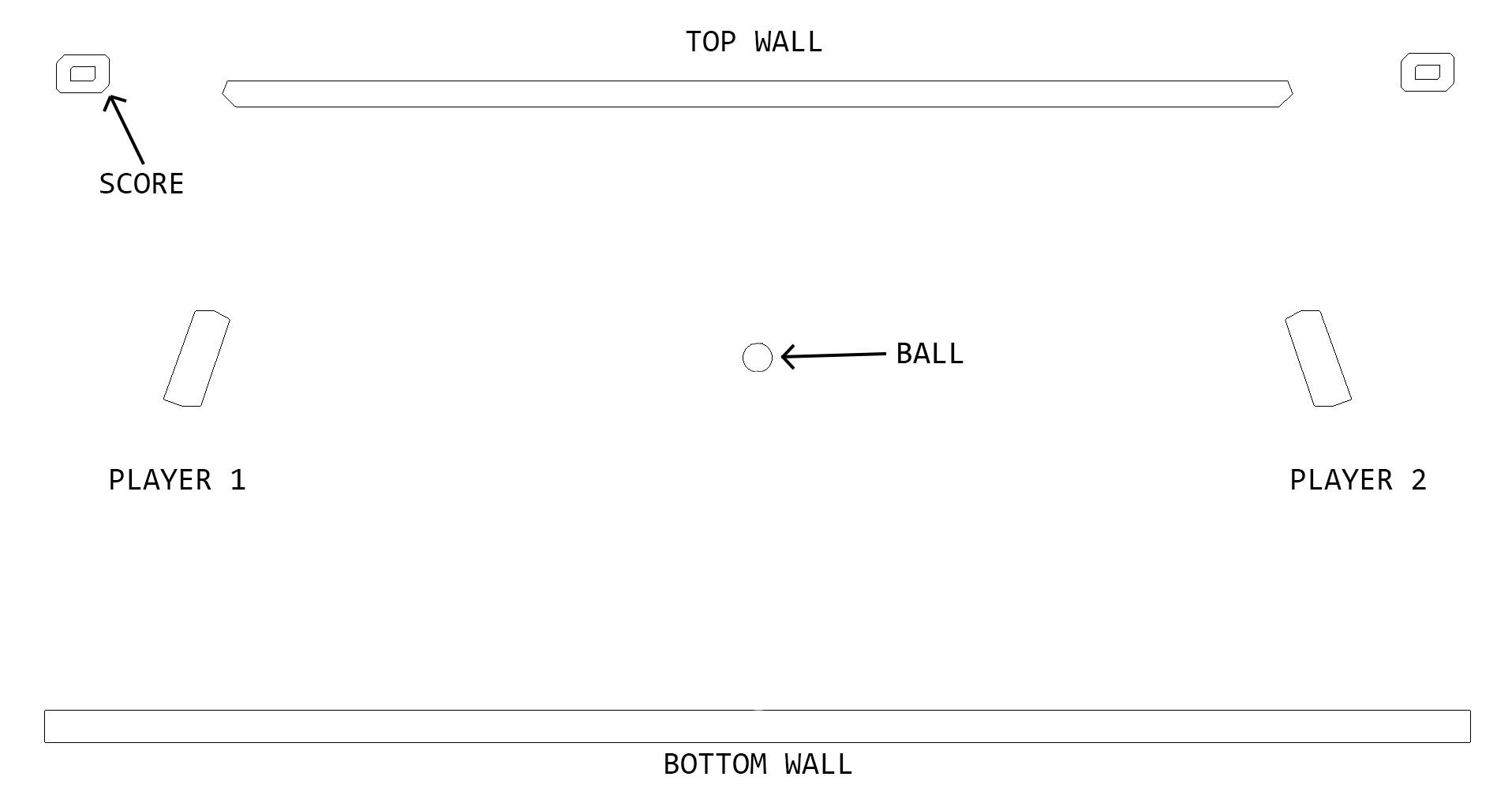The level is composed of the same elements as the original game but this use a top down perspective instead of a zenithal perspective. The field consists of a top wall, a bottom wall, two paddles and a counter for each player's points.