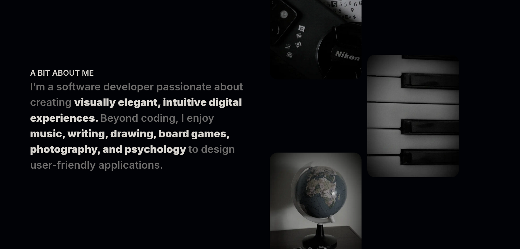 Personal Portfolio claudiodimaio.netlify.app Used to showcase my projects and technical skills Screenshots Technologies used React TailwindCSS NodeJS Setup To run on localhost: npm run dev To build: npm run build To create a component (Atom, Molecule, Organism): npm run plop To fix vulnerabilities: npm audit fix To install dependencies: npm install