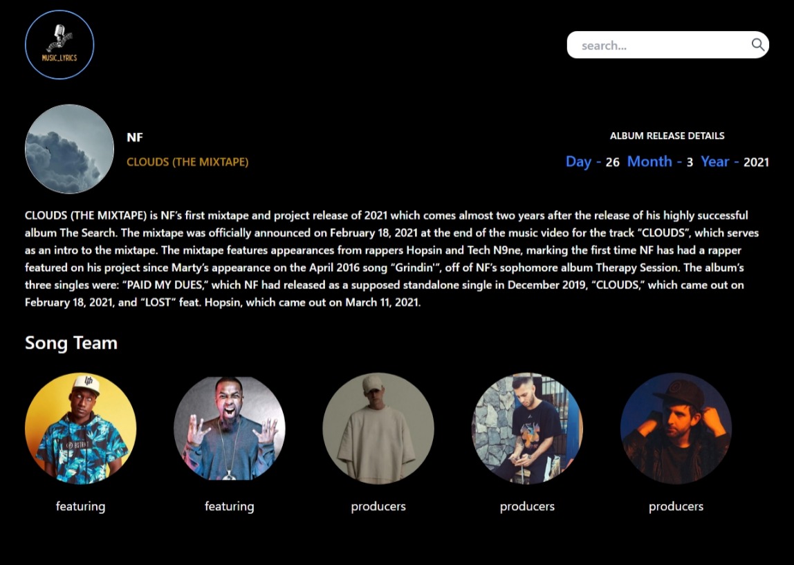 A music search app built with React and Rapid API, allowing users to search for music and view details about singers, albums, and songs. Features include trending music, singer profiles, and the ability to watch songs directly on YouTube. A simple, interactive way to explore and enjoy music content