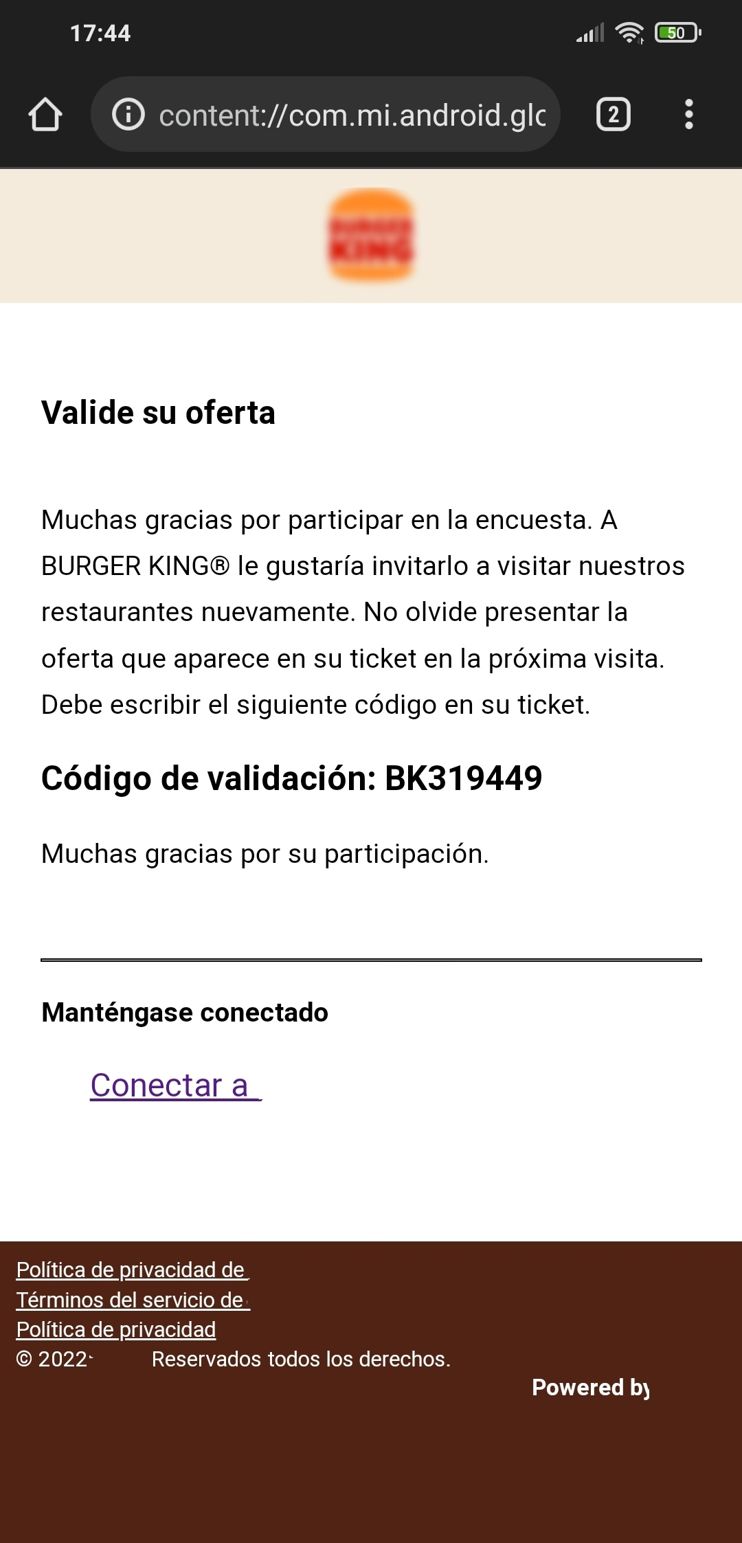 Gerera un código de validación de la encuesta de satisfacción, mostrándolo en una copia exacta de la interfaz de la web miexperienciabkespana.com.