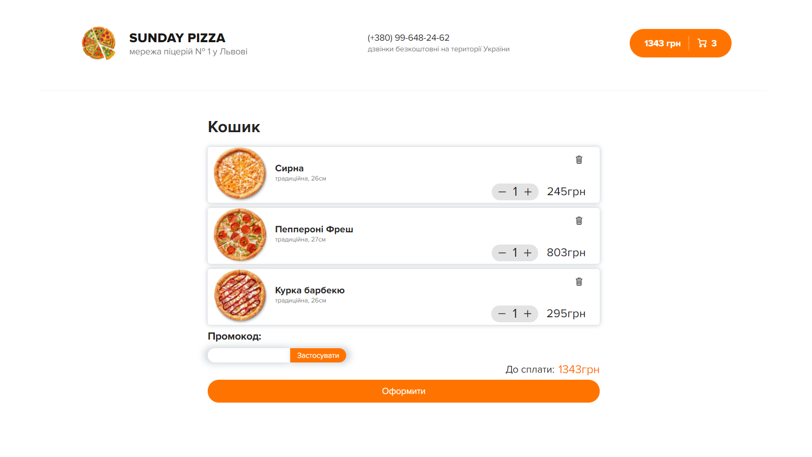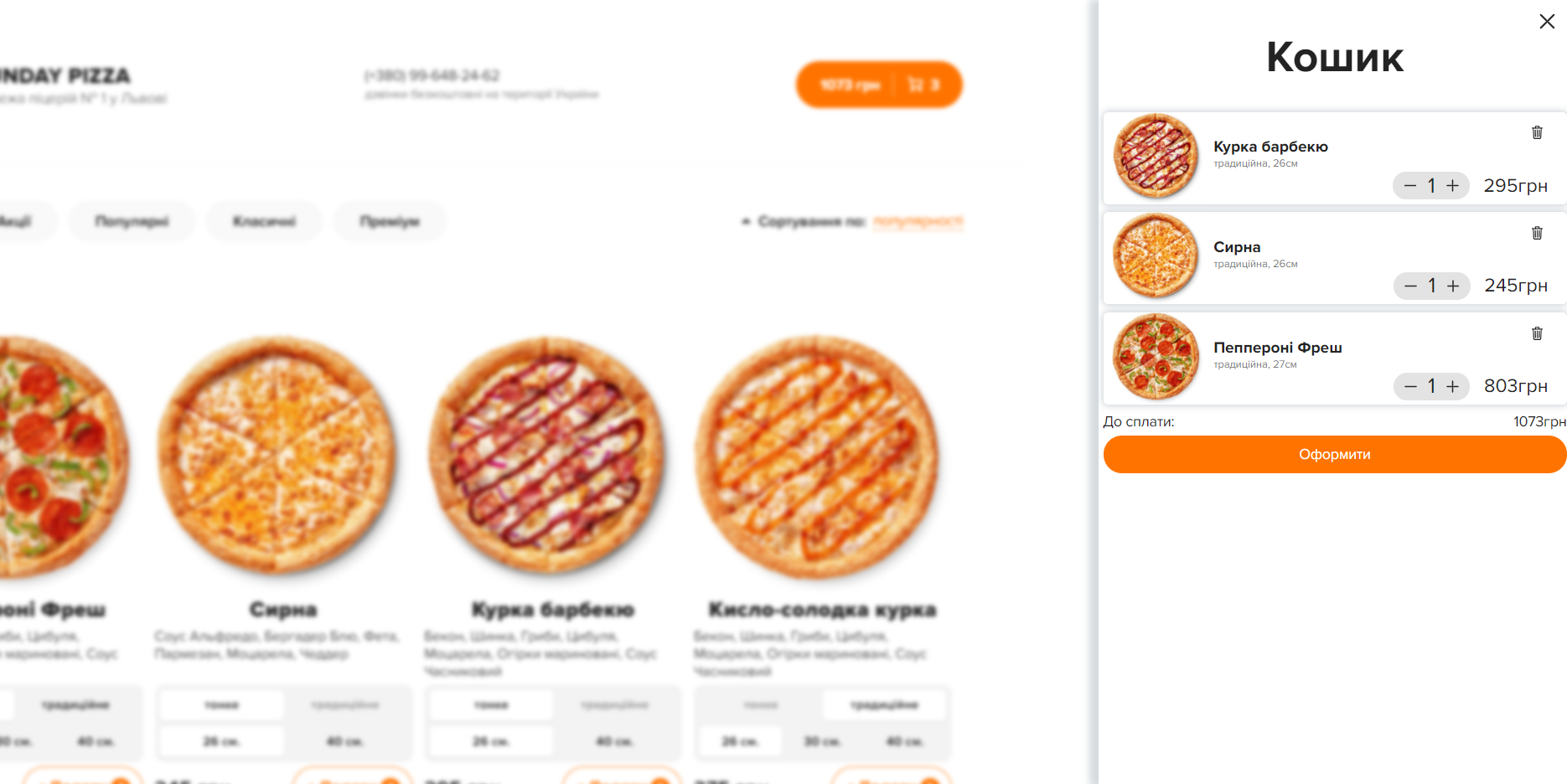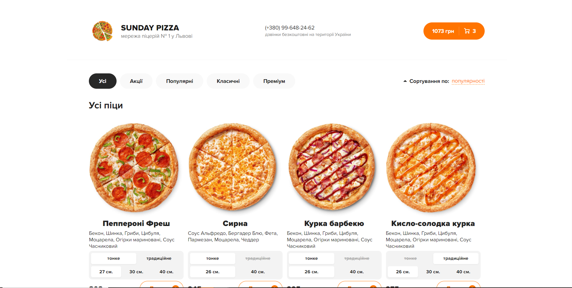 SUNDAY PIZZA This project is a model of web store. Status: in progress 75%... Technology stack React.js React-router-dom React-redux Redux Axios To INSTALL the project clone it on your local computer, than run script "npm install". You need to have node.js (v14.17.5) installed on your local mashine. To RUN the project use "npm start" About the project Home page Slidebar cart Cart page