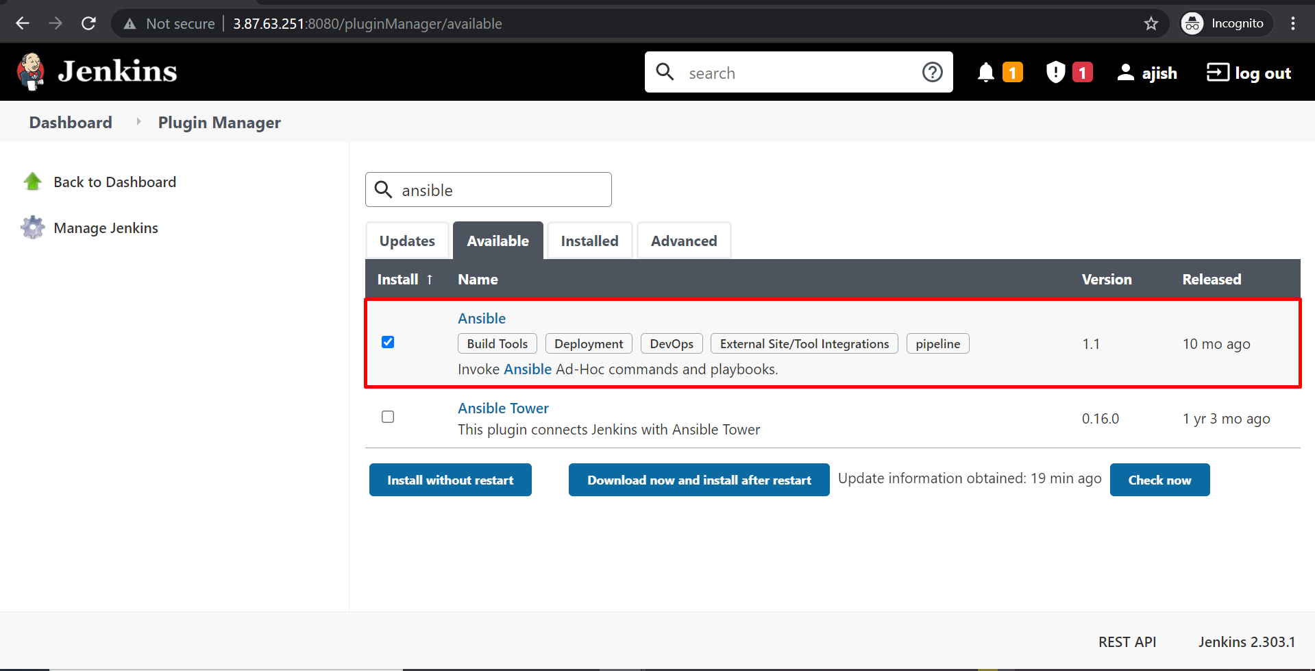 - Configuration proceeds with the installation of the plugin "Ansible". For the same navigate to