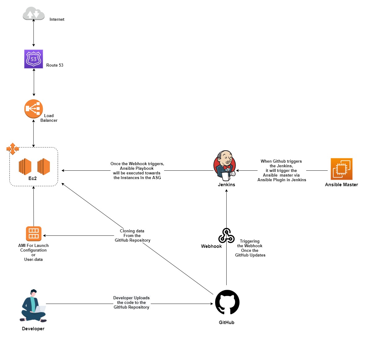 Here is a project with a rolling update for the auto-scaling group. Initially, I will provide a basic idea of the infrastructure implemented here. Developers are provided with a Central Github repository for updating the files in the website application. They will be pushing the codes to the repository and once the repository is updated, the new changes should reflect in the website application automatically.