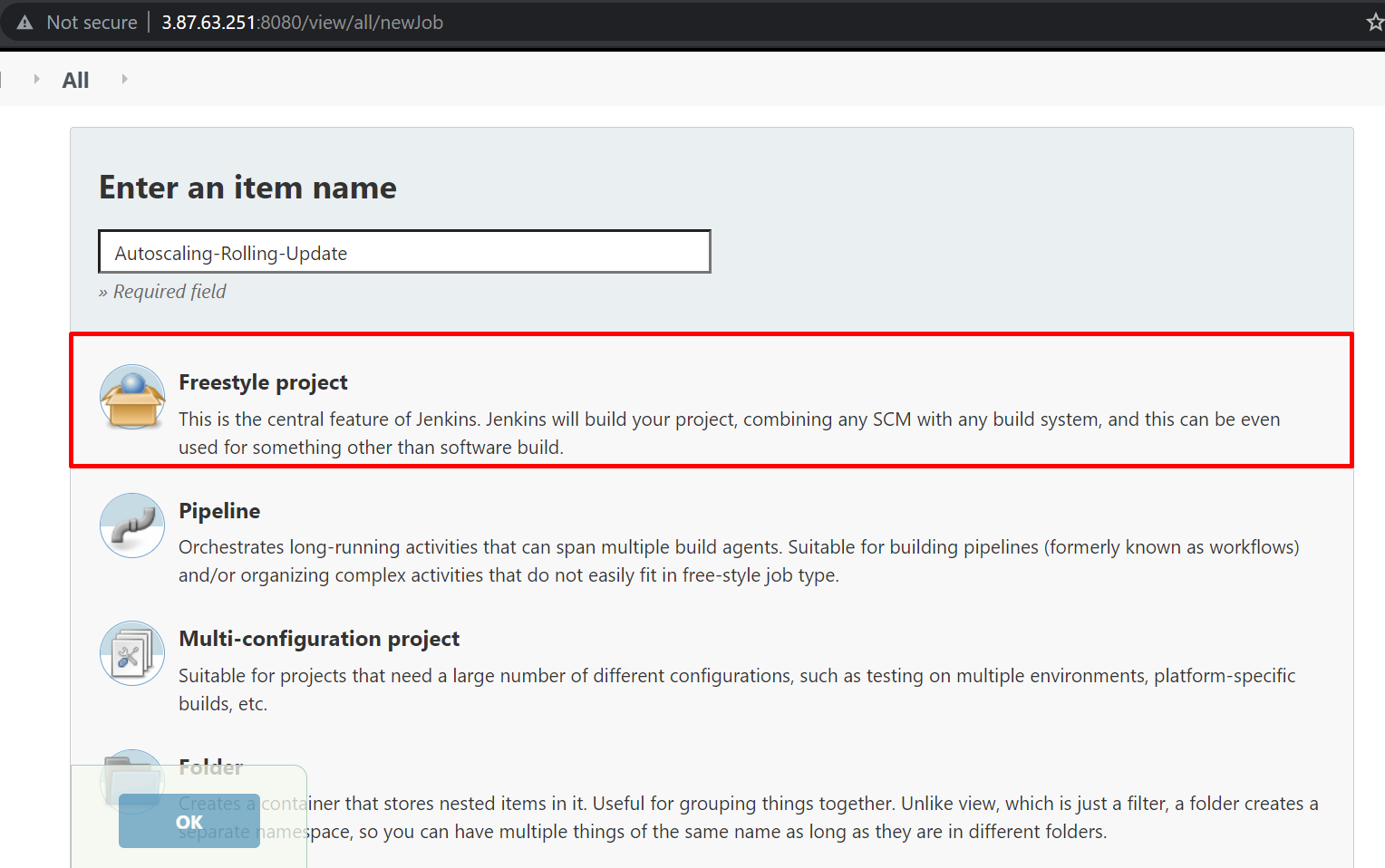 Then move forwards with the creation of the job in Jenkins and proceeds with the selection of Freestyle Project