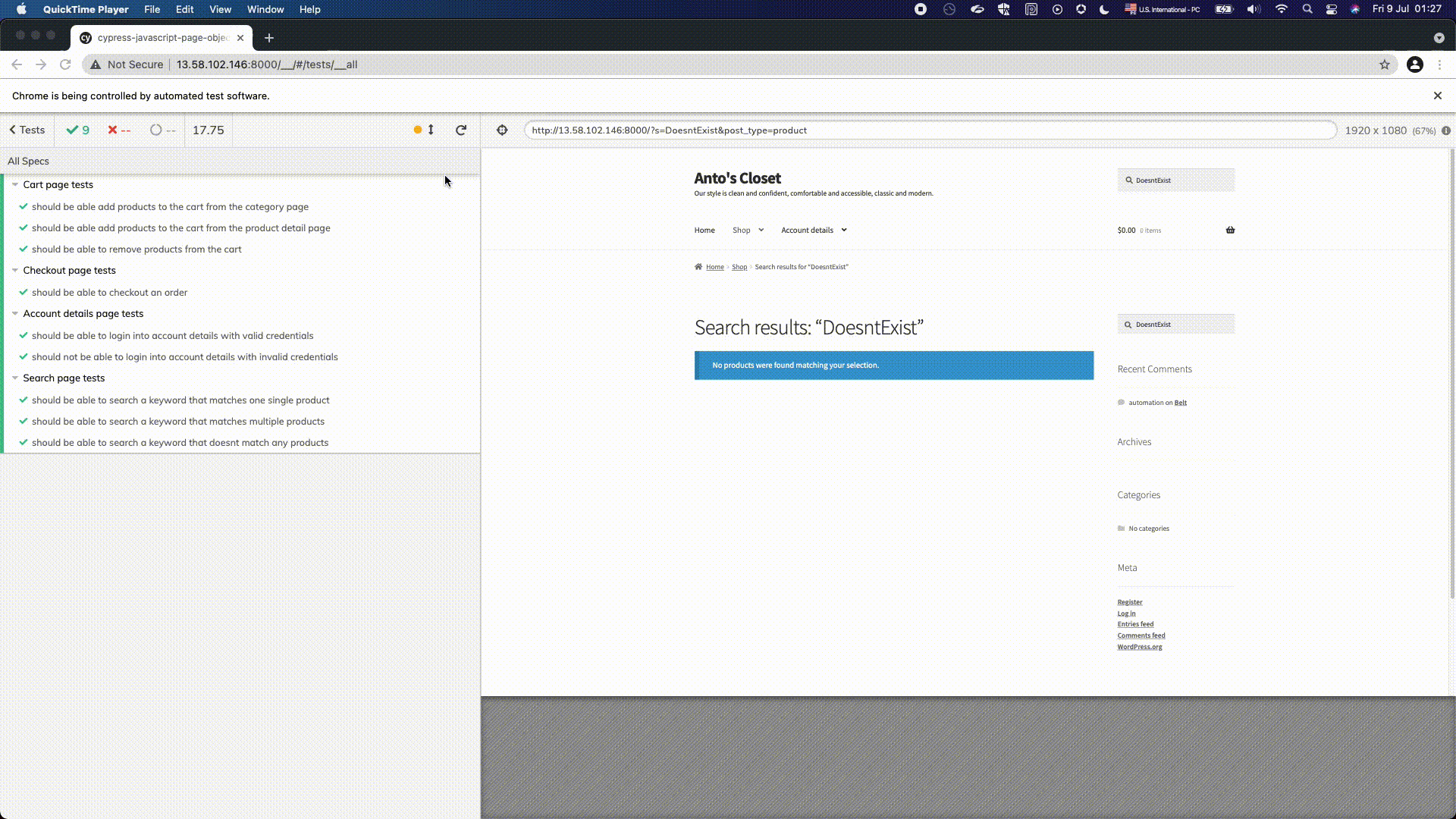 - Nine tests in total were implemented as part of this framework using TypeScript as the backbone programming language