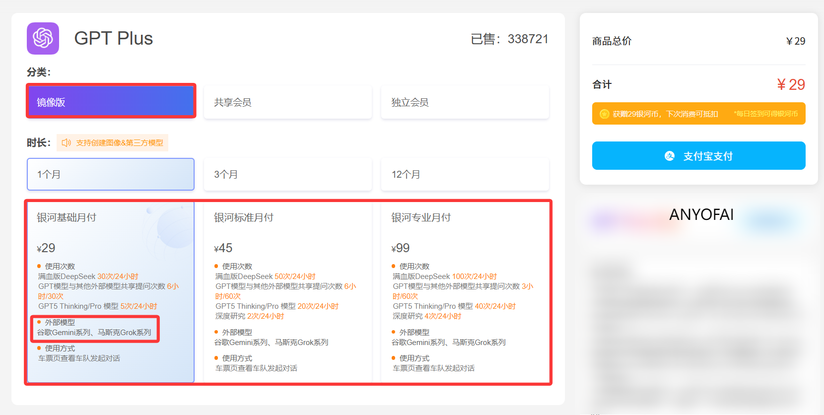 通过银河录像局来拼车合租Gemini Pro会员的价格也十分便宜,其中银河基础版每月仅需29元,银河标准版每月45元,银河专业版每月99元,现在使用优惠码“ANYOFAI”还可以享受九折优惠。