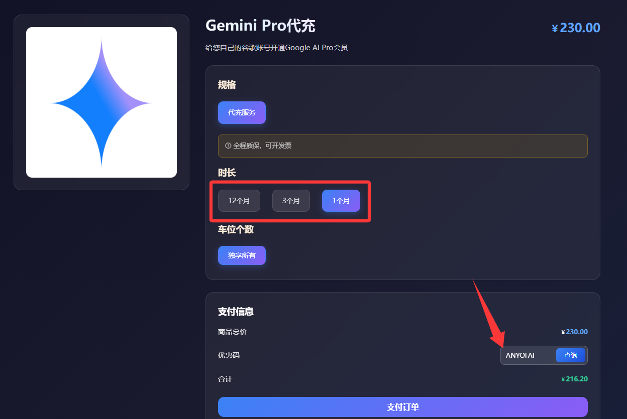 星际放映厅目前提供的Gemini Pro代充值服务共有三种价格套餐,分别为1个月套餐、3个月套餐和12个月套餐。其中,1个月套餐价格为230元/月,使用优惠码“ANYOFAI”可享受九折优惠,折后仅需216元/月;12个月套餐价格为158元/月,使用优惠码“ANYOFAI”同样可享受九折优惠,折后仅需148元/月。我们仍然建议大家直接选购12个月套餐,这样不仅可以省去每月续费的麻烦,而且整体性价比也更高。