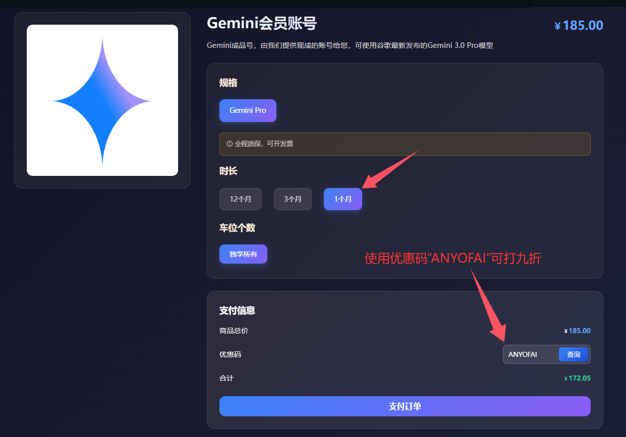 星际放映厅提供的Gemini Pro成品账号共设有三种套餐,分别为1个月、3个月和12个月。其中,1个月套餐价格为185元/月,使用优惠码“ANYOFAI”可享九折优惠,折后价格为172元/月;12个月套餐价格为158元/月,使用优惠码“ANYOFAI”同样可享九折优惠,折后价格为148元/月。综合来看,我们更推荐大家选择12个月套餐,这样不仅可以省去每月续费的麻烦,而且整体性价比也相对更高一些。