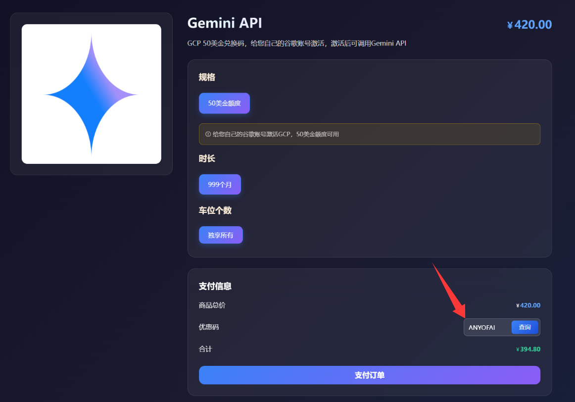 除了提供Gemini Pro成品号和Gemini Pro代充值服务之外,星际放映厅还提供Gemini API相关服务,主要用于协助用户为自己的Google账号完成Google Cloud Platform的开通与激活。该服务会为用户的Google账号提供50美元可用额度,用于后续调用Gemini API,用户无需自行处理GCP开户、账号验证或支付设置等繁琐流程。整个GCP开通及额度激活流程由星际放映厅协助完成,额度直接绑定在用户本人的Google账号中,使用方式与官方渠道保持一致,适合希望使用Gemini API但对相关开通流程不熟悉的用户。