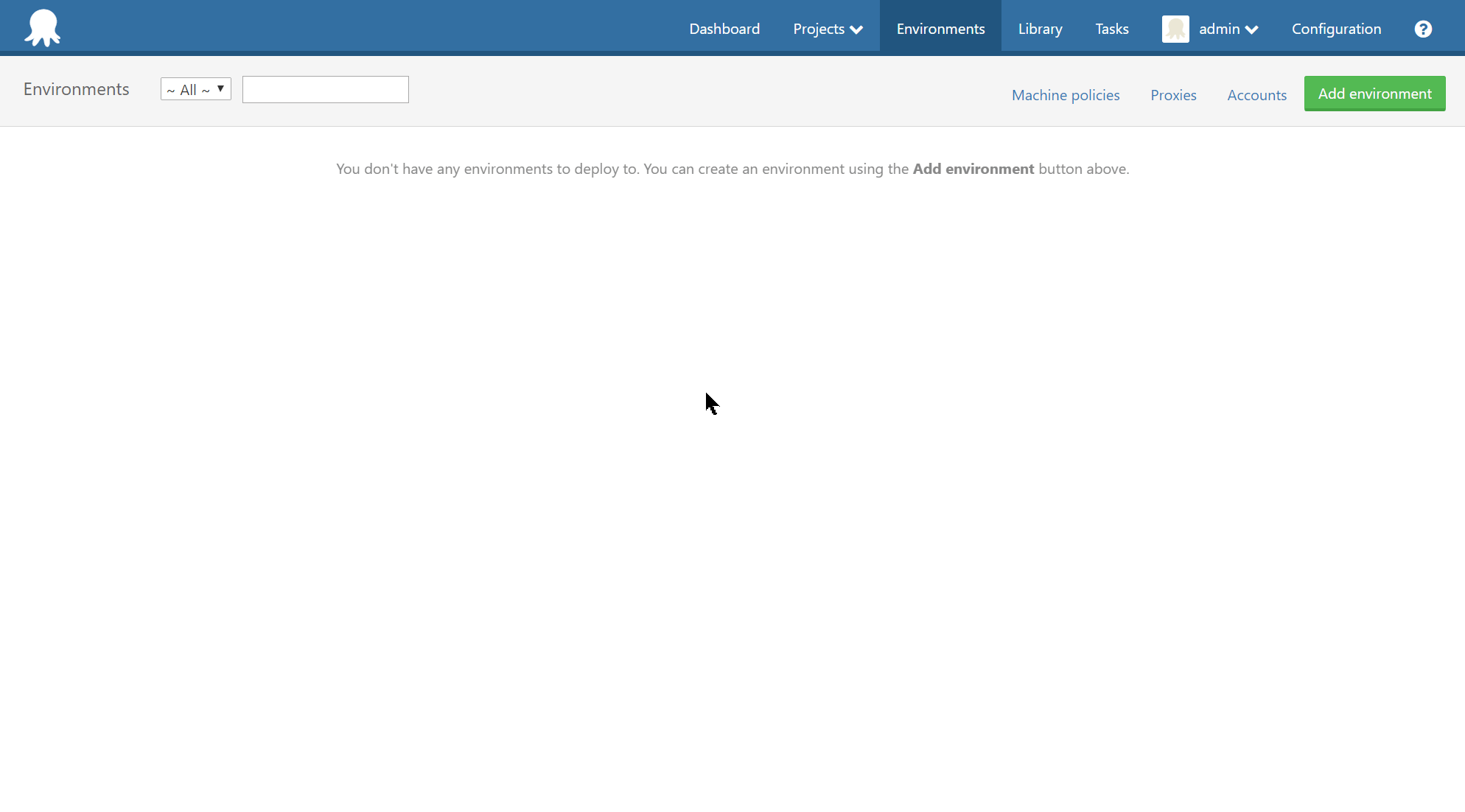 Now we will create our "Environment" to place our Web Server in. This can be done by clicking environment in the top header on our octopus dashboard. Once there you will click on the Green Add Environment button in the right. Here you will name it, and I would recommend checking Use Guided Failure mode by default.