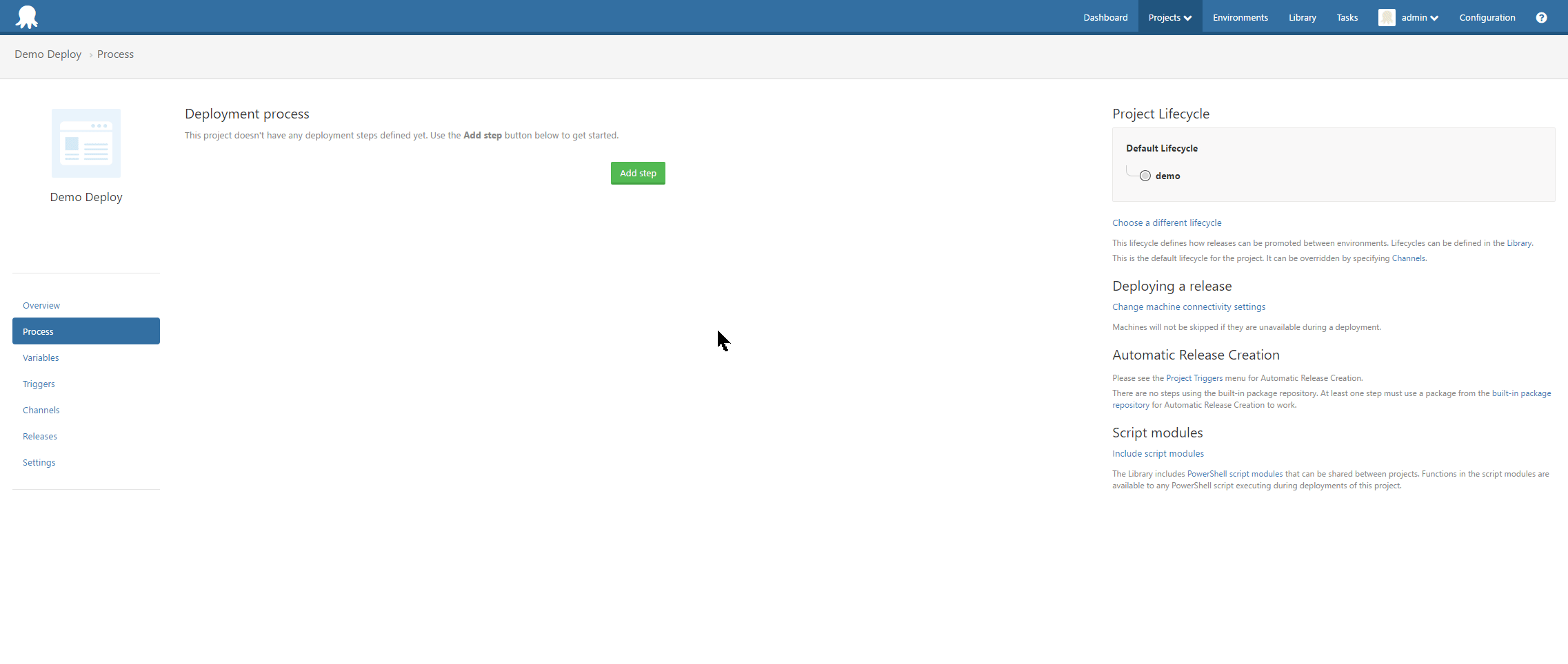 On your dashboard click on the Demo Deploy we created, then click on process on the left hand side and then on the middle of the screen click on add step. We will then click on Deploy a package.