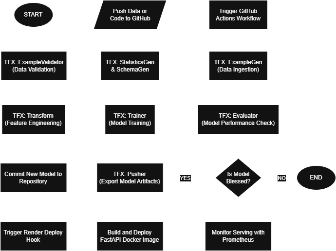 The MLOps pipeline is integrated with GitHub Actions to achieve Continuous Integration and Continuous Deployment (CI/CD). Whenever new data is committed to the repository or the module code is updated, GitHub Actions automatically triggers the TFX pipeline. This process includes data ingestion, schema validation, feature engineering, model training, and rigorous evaluation.