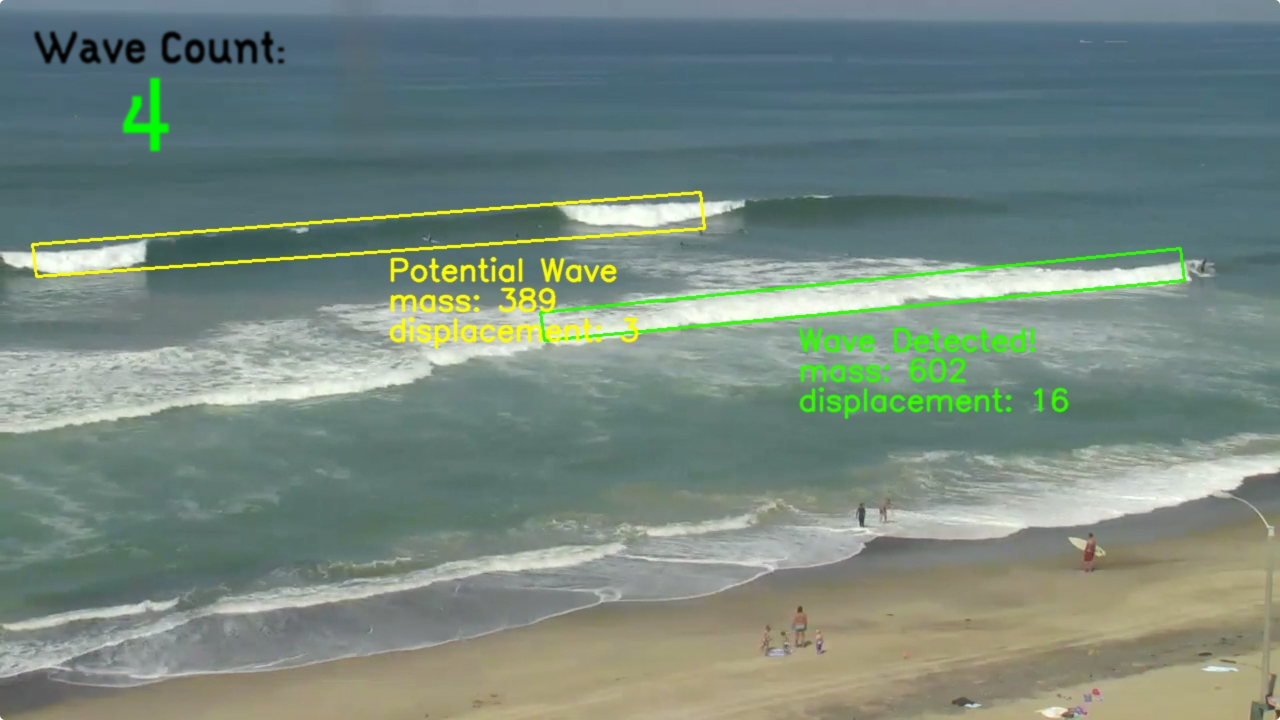 As a vision-based project, this program performs best on scenes in which the object of interest (the wave) is sufficiently separated from other objects (i.e. there is no occlusion or superimposition). This assumption is fair for the wave object as ocean physics dictate that near-shore waves generally have consistently delineated periods of inter-arrival times, due to the physical processes of assimilation, imposition, and interference that take place a great distance from shore.