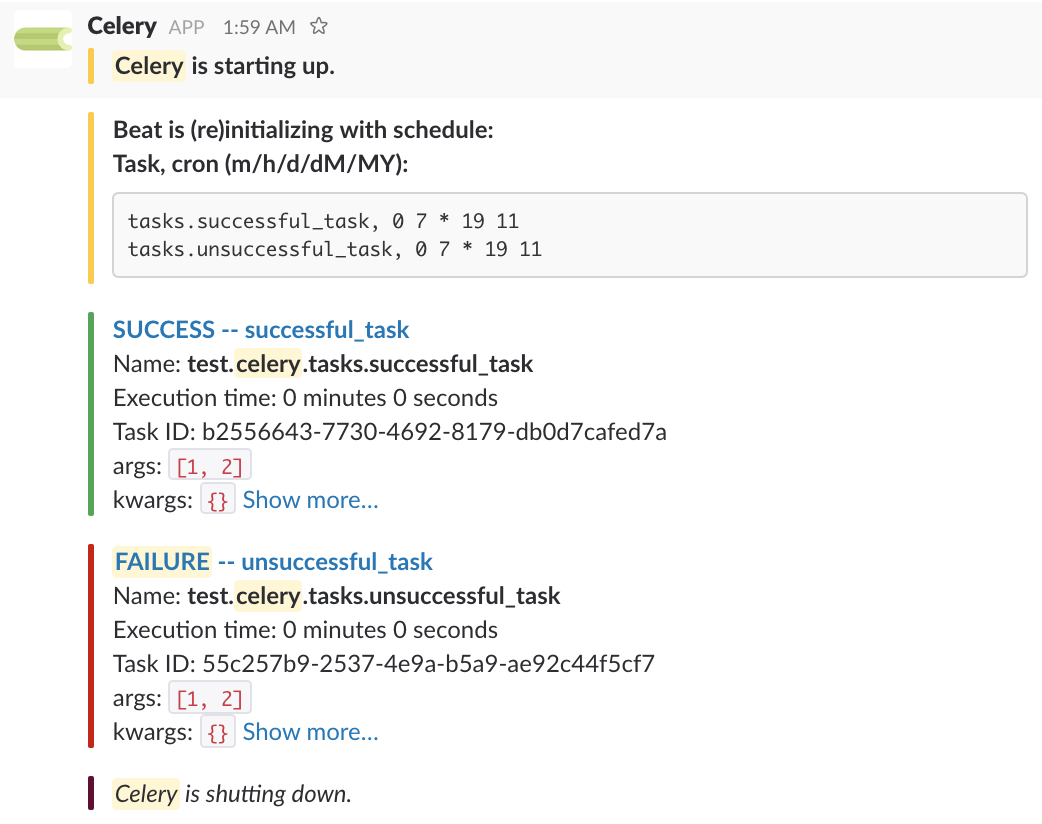 app.start()Celery-slack offers a number of configuration options to customize the look and output of Slack messages. The following are the default options of the extension: