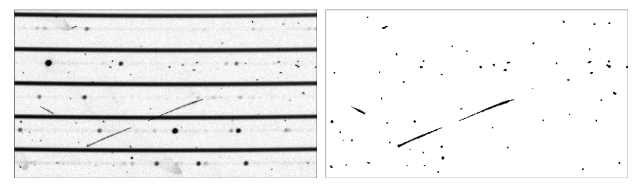 NRES model detects CRs over the spectrum robustly on a LCO NRES spectroscopic image. The horizontal bands in the left image are the spectroscopic orders, which are left out of the CR mask.