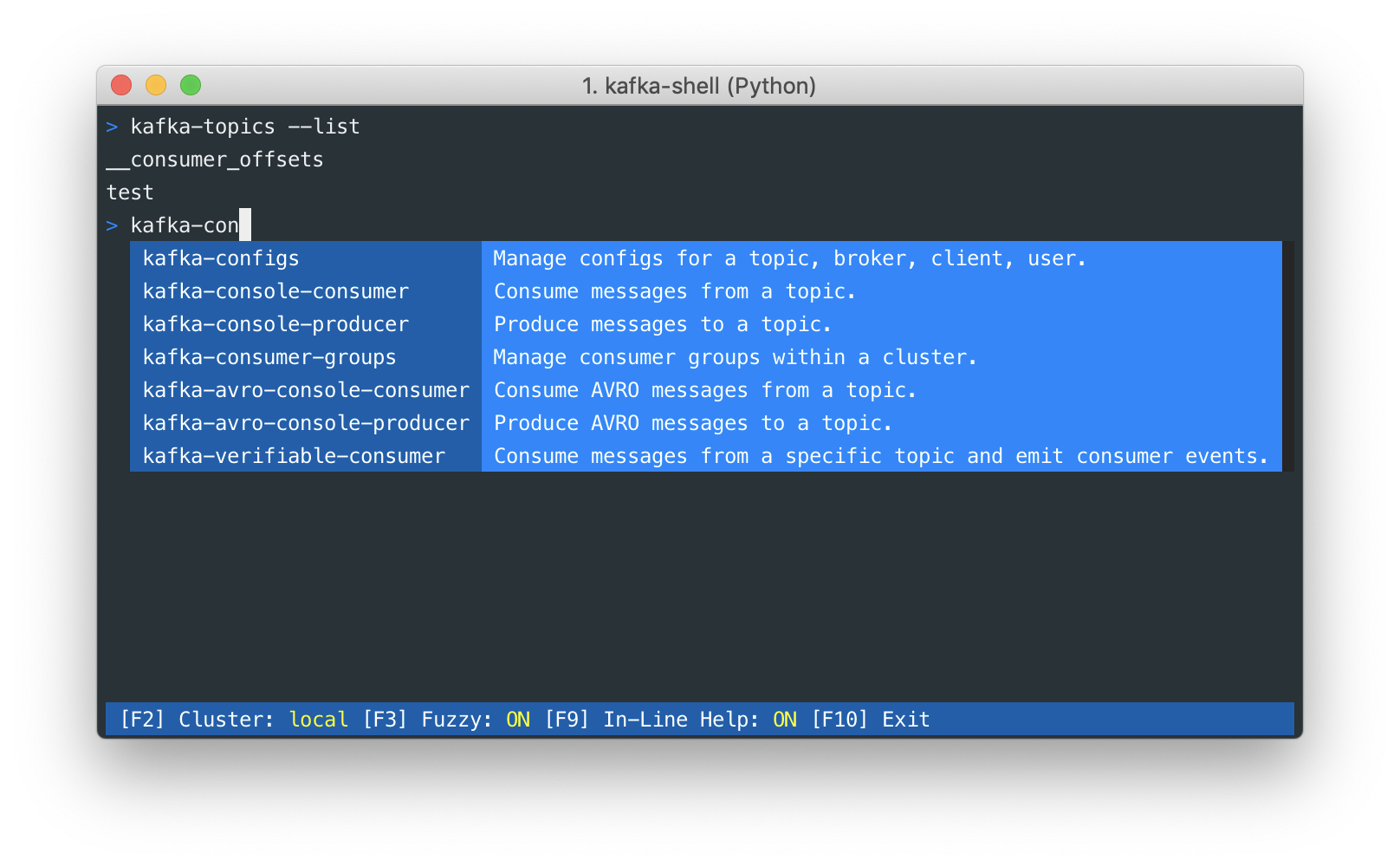 Kafka shell simplifies running complex Kafka CLI commands as well as provides smart auto-completion of commands, options, and more. /Users/shawn/.kafka-shell/config.yaml