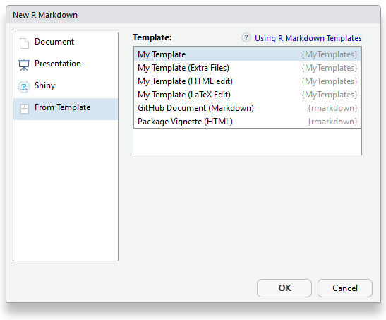 - My Template (Custom Format): this uses a custom R Markdown format to use extra files without a copy having to be made to the directory (see Chapter 18)