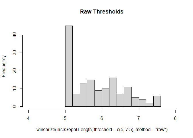 xlim = c(4, 8), main = "Median+-MAD Winz")hist(winsorize(iris$Sepal.Length, threshold = c(5, 7.5), method = "raw"),