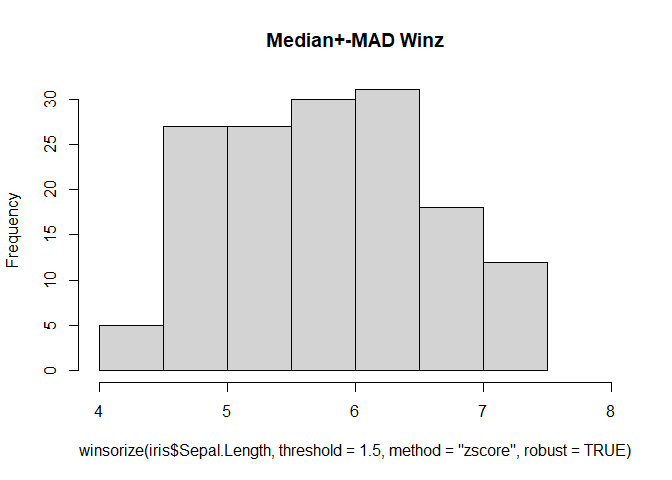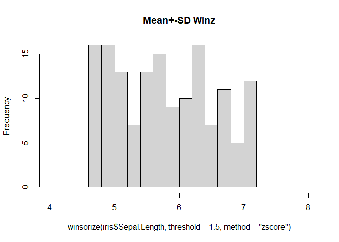 xlim = c(4, 8), main = "Mean+-SD Winz")hist(winsorize(iris$Sepal.Length, threshold = 1.5, method = "zscore", robust = TRUE),