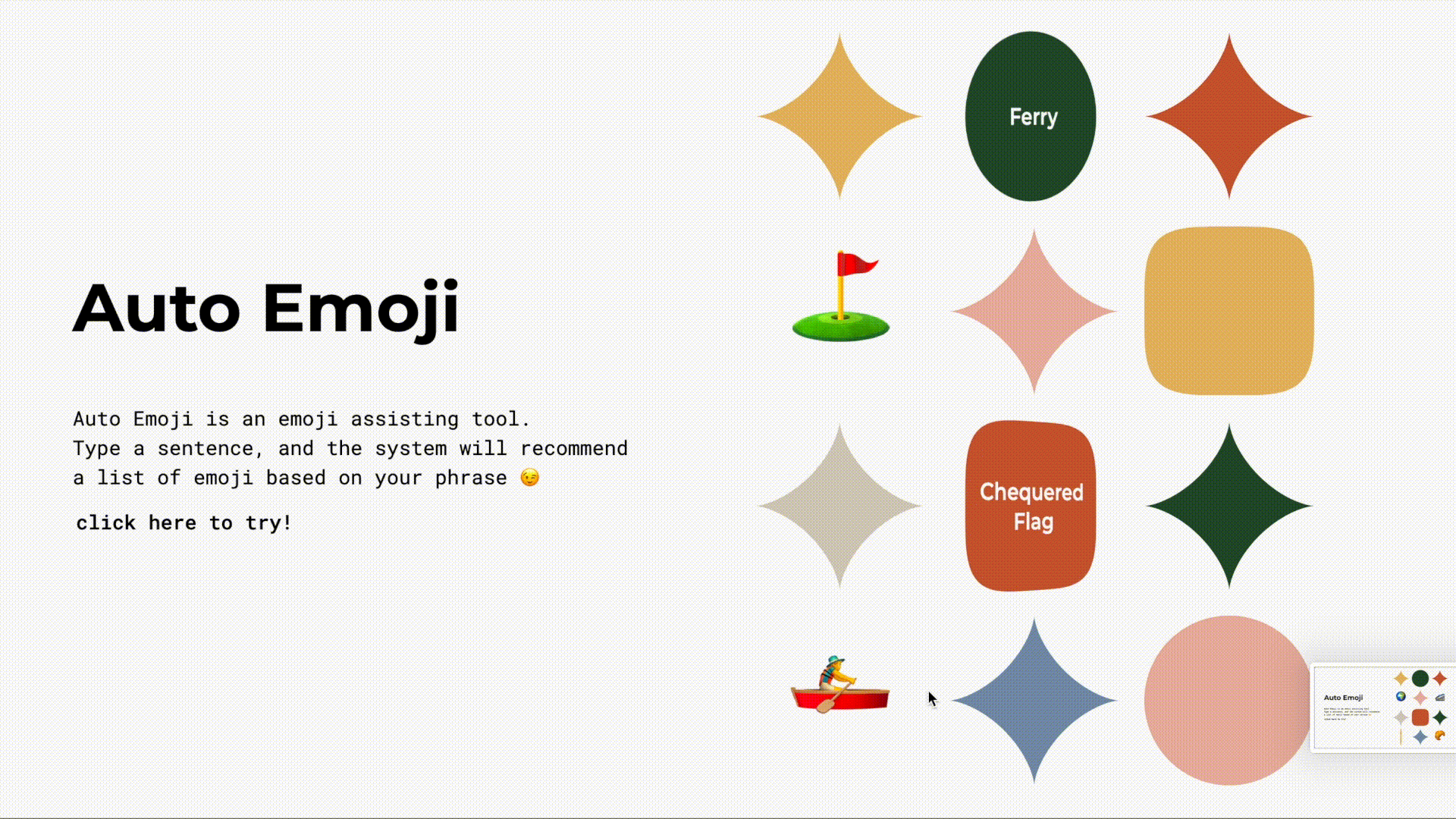 Auto Emoji π is an emoji assisting tool. Type a sentence β¨οΈ and the system will recommend a list of emoji based on your phrase π¬ It's a course project for NTU AI Course by prof. Jane Hsu, and more details can be seen here.