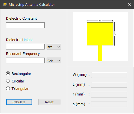 This antenna patch calculator can simplify the calculation of antenna dimensions for rectangular, circular and triangular shapes.