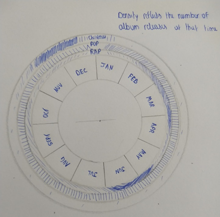 A third design is a static alternative to answer the question of song characteristics per season or per month. For every month, per genre, there is an additional notch per song or album added to the genre’s ring. Tweaking different aspects of the design, such as colour, these circular notches might make the design look like a CD or a vinyl disc.