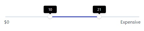<Slider tooltip=hover minLabel='$0' maxLabel='Expensive' min={0} max={30} bind:value />To change the values on the tooltip we can add a value format by using valueLabel prop.