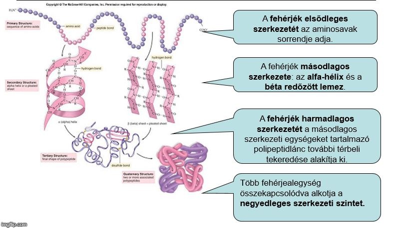 - szerkezete: 100 aminosavból álló fehérje esetén 2^100 egymástól eltérő lehet