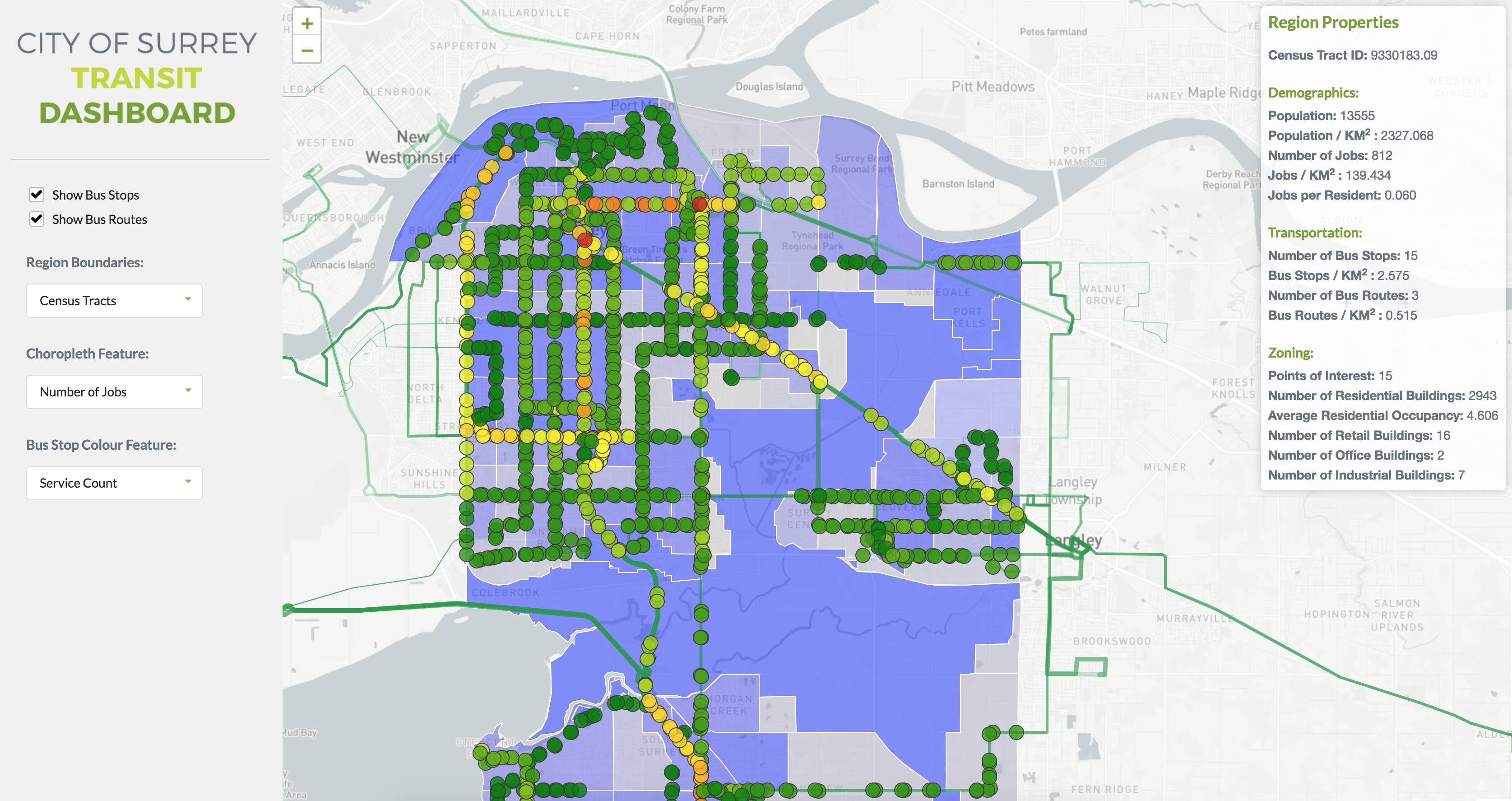 This public transportation dashboard was developed as part of the Data Science for Social Good program at the University of British Columbia. It provides a layered interface for visualization of public transportation networks and service availability, with options to explore how transportation and socioeconomic factors interact within a region.