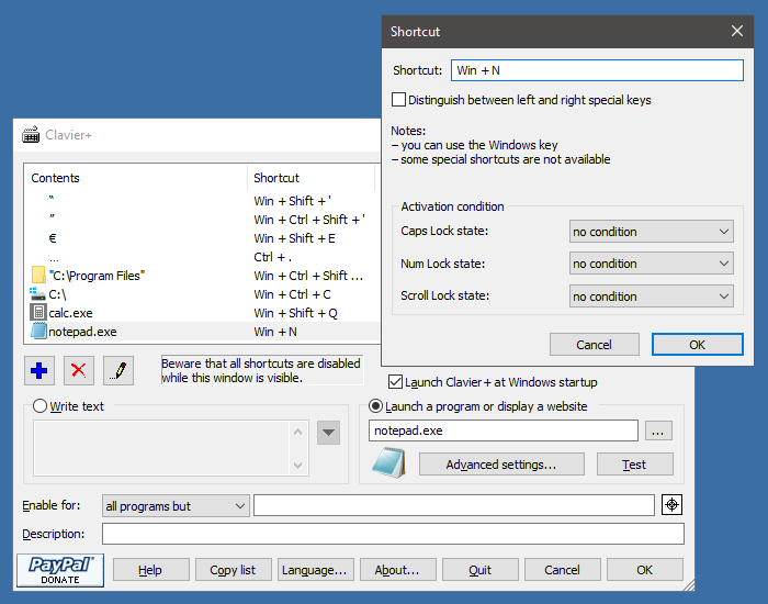 Clavier+ is a Windows utility that allows to create keyboard shortcuts involving almost any key, including the Windows keys, to launch programs, write text, open websites, ...