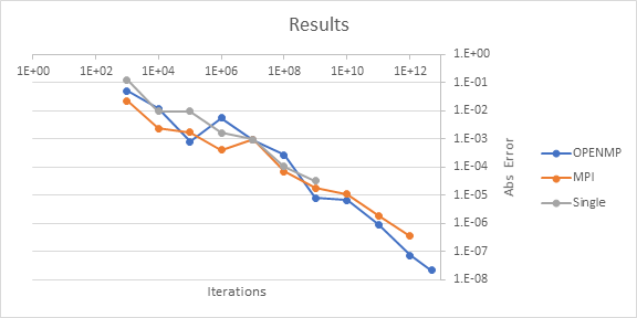 Parallel Monte Carlo pi Calculation Calculating π with a parallel Monte Carlo implantation in C Method There are 3 scripts for 3 differet implementations. Serial Implementation OpenMP MPI Results Time Plot Error Plot