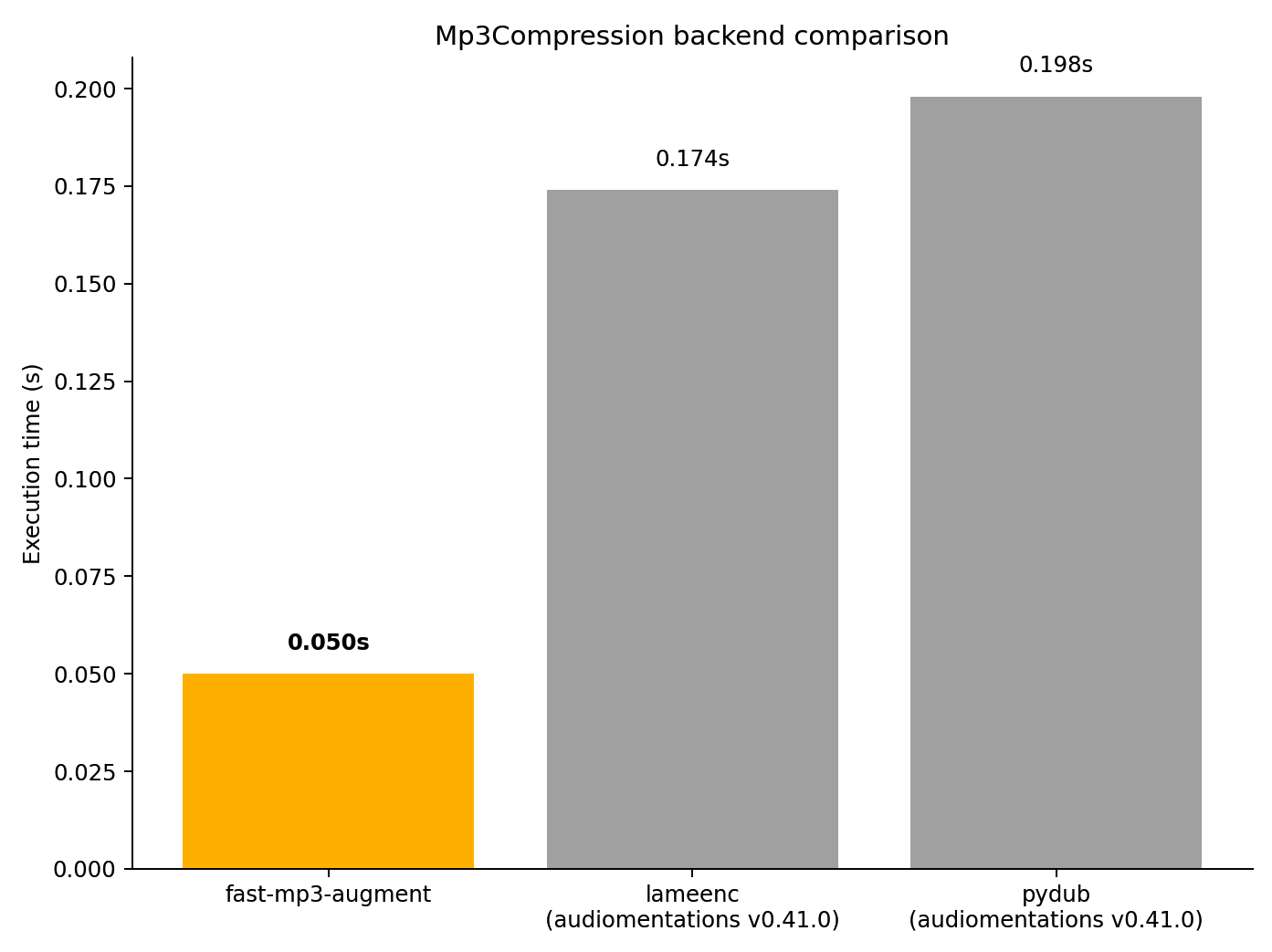 A quick performance benchmark (based on demo.py in audiomentations), which augmented 3 short (~7-9 sec) audio snippets (2 mono, 1 stereo) on a laptop with i7-13700HX and a 2 TB Samsung PM9A1 NVMe shows that fast-mp3-augment is superior when it comes to speed: