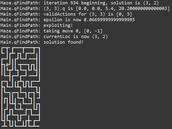 Mazes are generated with a recursive backtracking method. Each cell is a distinct state containing the Q-score of each potential action, initialized to 0. The reward function is the sum of the AI's Manhattan distance from the goal position and the amount of timesteps that have currently elapsed-- the AI seeks to minimize this reward, rather than maximize it.