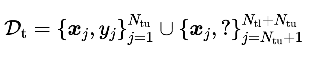 书27页半监督领域自适应情形的公式感觉有误,不知道这样是否更合适? $$ \mathcal{D}_{\mathrm{t}}=\left\{\boldsymbol{x}_{j}, y_{j}\right\}_{j=1}^{N_{\mathrm{tu}}} \cup\left\{\boldsymbol{x}_{j}, ?\right\}_{j=N_{\mathrm{tu}}+1}^{N_{\mathrm{tl}}+N_{\mathrm{tu}}} $$