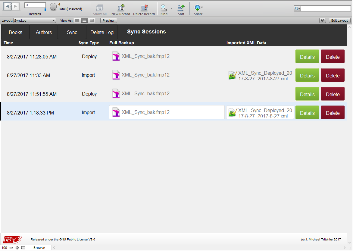 The example database, XML_Sync.fmp12, demonstrates how the syncing process works using a simple database of Authors and Books. The Authors table has a one-to-many relationship to the Books table. i.e. One author can write multiple books.