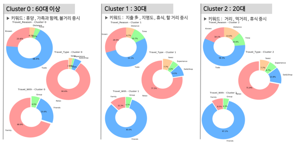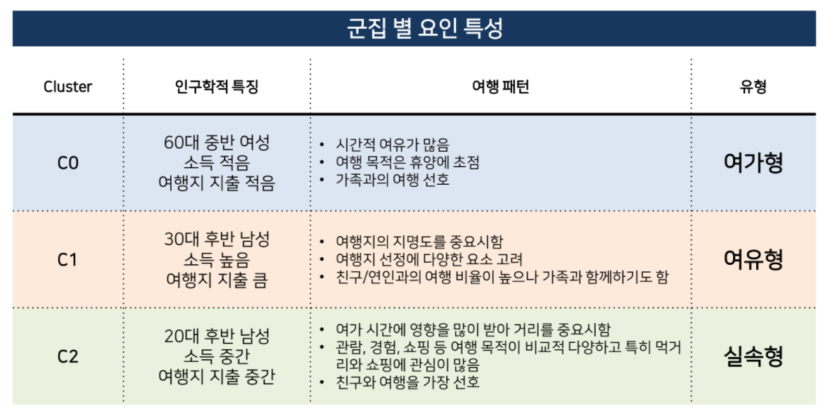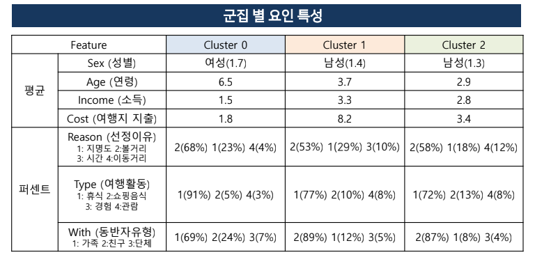 - Through the analysis of travel status and clustering of single-person households, it is intended to find out the travel patterns of single-person households and the characteristics of each cluster. 1인 가구의 여행 실태 분석과 군집화를 통해 1인가구 만의 여행 패턴 및 군집별 특징을 알아보고자 함.
