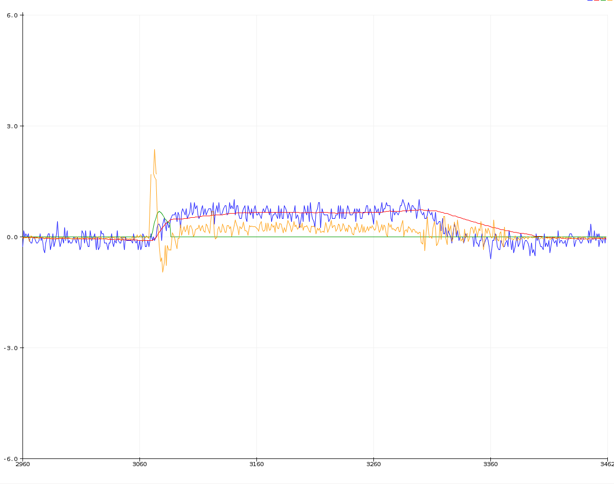 - Red: Two step Kalman/Complementary filter estimated altitude (m).