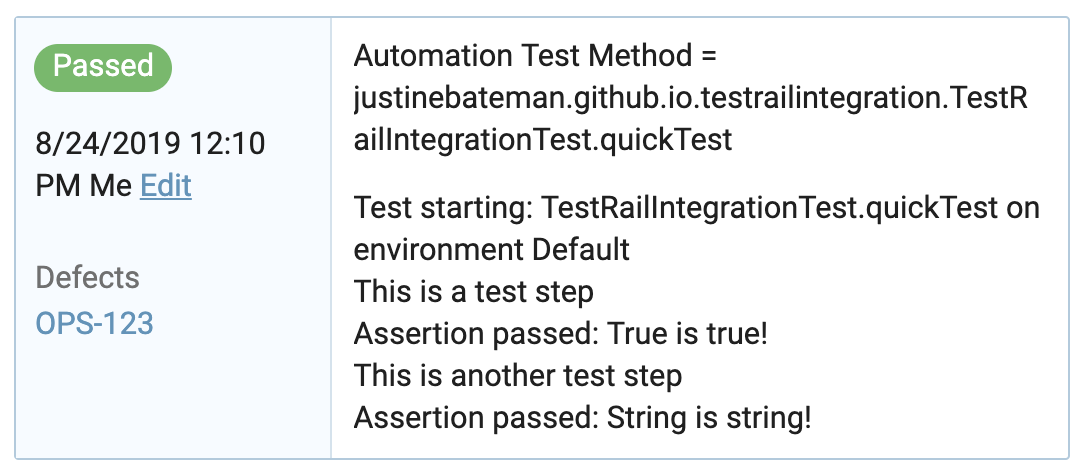 The above TestNG test case will create the following test result in TestRail