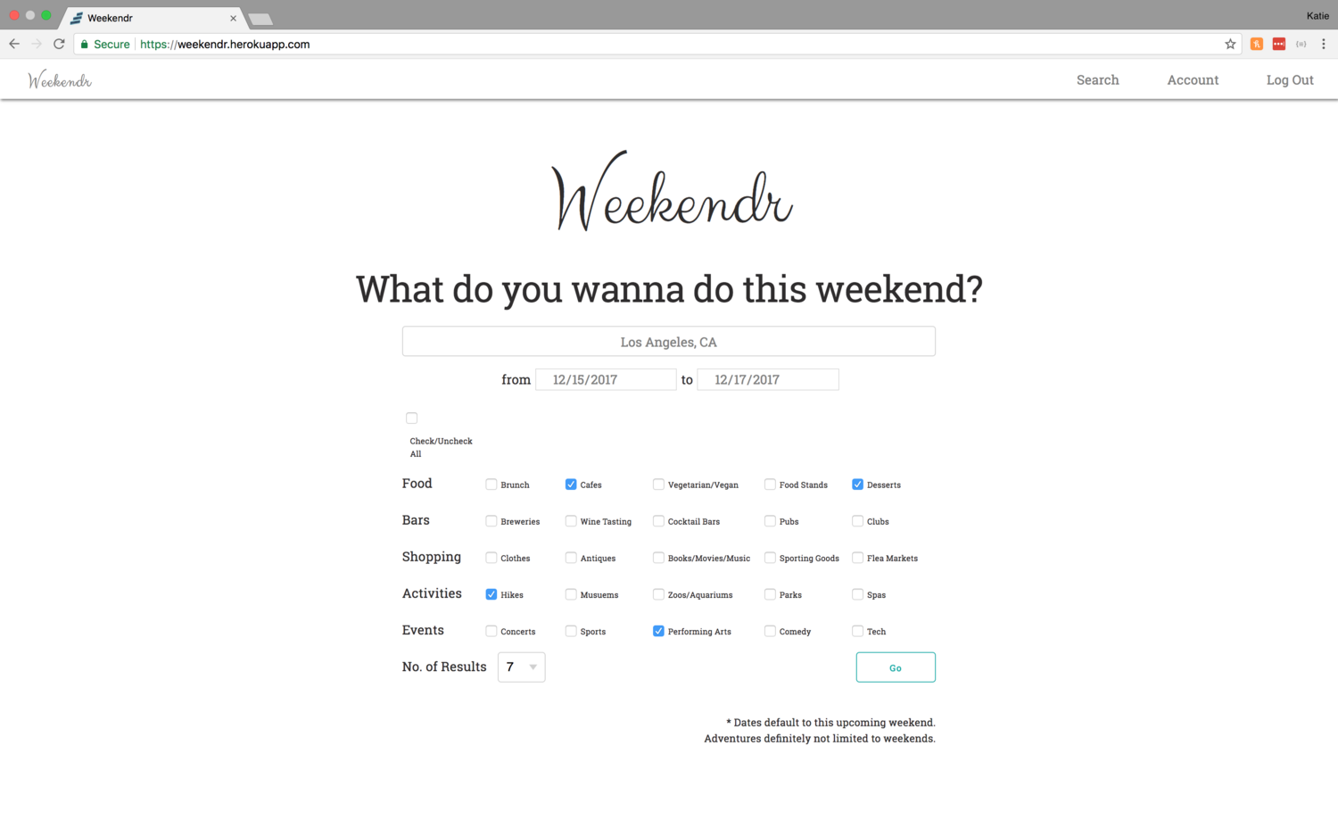 The weekend is coming. Do you have plans? If you need some help nailing dwn stuff to do, Weekendr is here for you. Just select a location, dates, activities that interest you, and how many results you want to see, and get back a snapshot of options.