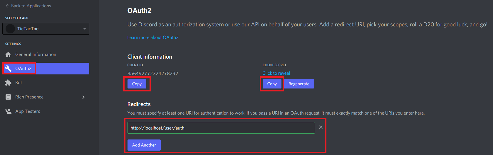 - Go to the OAuth2 tab, copy client ID and client secret. Specify redirect URL like this:
