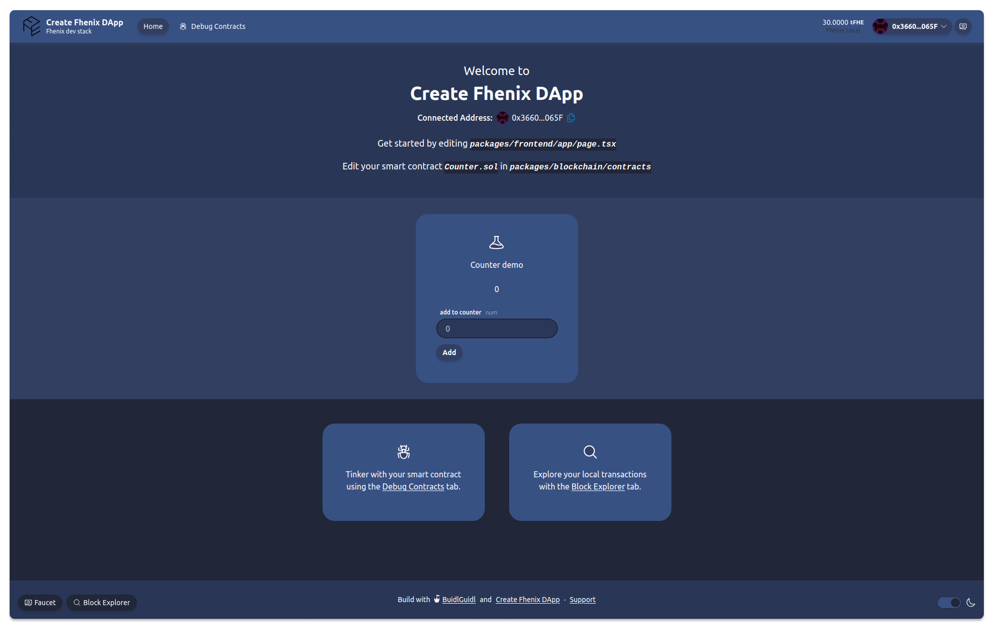 Visit your app on: http://localhost:3000. You can interact with your smart contract using the Debug Contracts page of the Counter demo on the frontpage.