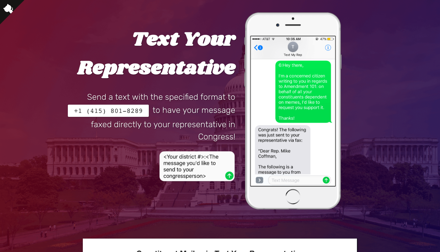 Note: The live version of this (at itskrish.co/text-your-rep) only uses Phaxio's test API key & secret, meaning that the faxes aren't currently being sent (even though Phaxio's corresponding callback runs); if this project receives enough interest, I'll replace the test keys with real ones (although I'd hope someone with more funds would deploy this instead OR just donate to me).