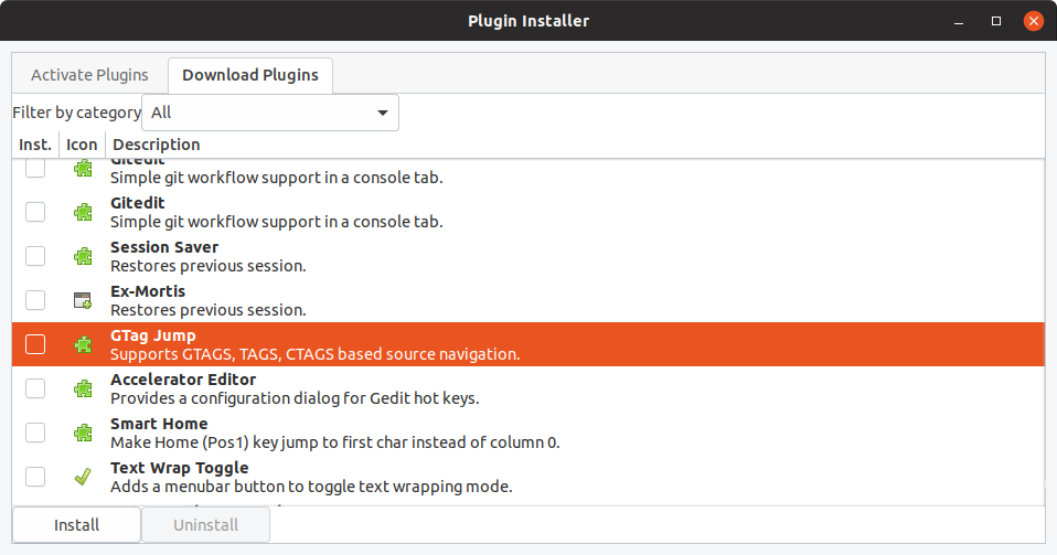 Finally start Gedit and enable the plugin installer under Preferences / Plugins.