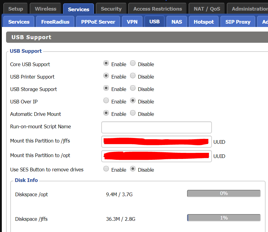 - Disable internal flash (JFFS2) if you already have a USB drive mounted as /jffs.