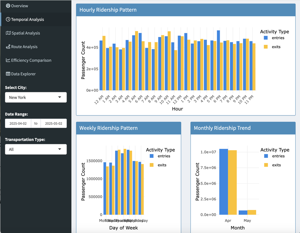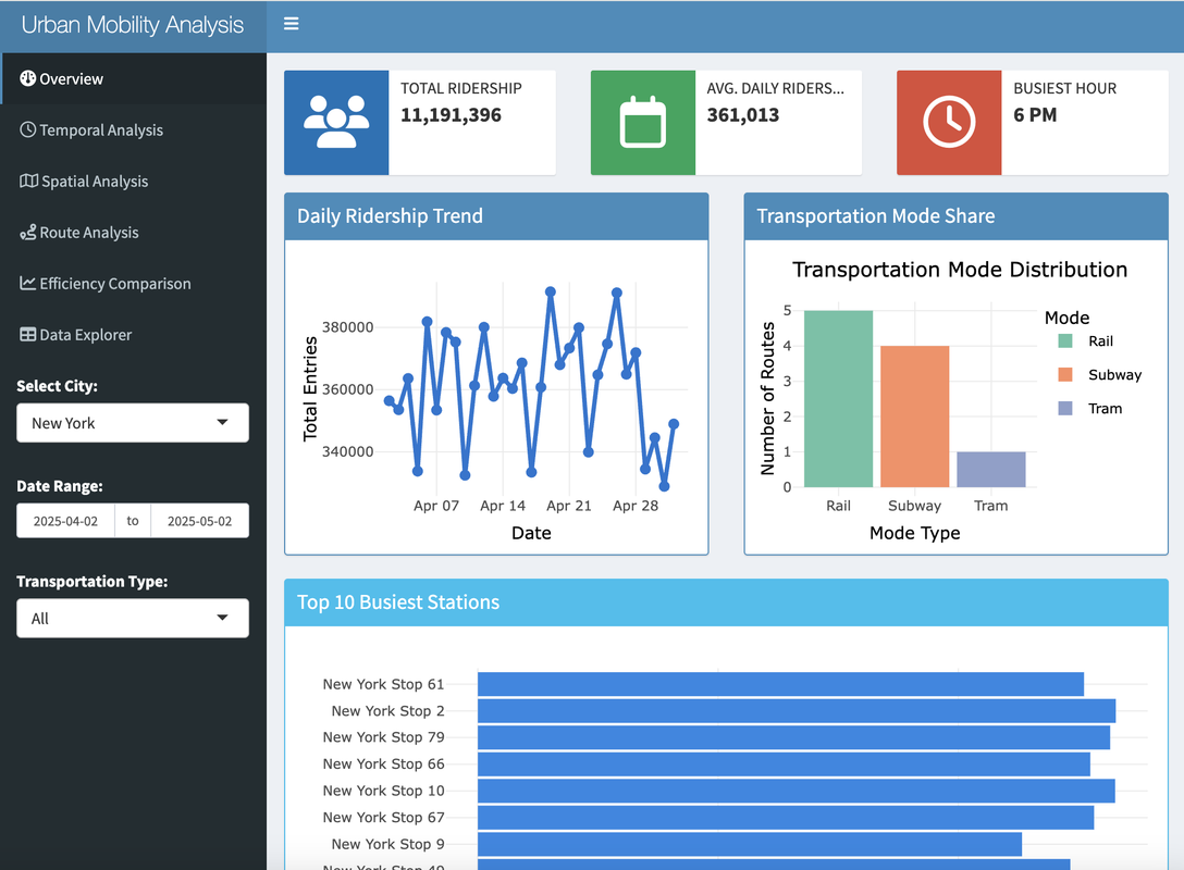 Urban Mobility Analysis is an interactive dashboard that visualizes transit data for different cities! It's like having the pulse of a city's transportation network at your fingertips. Watch as buses zoom, subway stations buzz with activity, and discover the secret rhythms of urban movement!