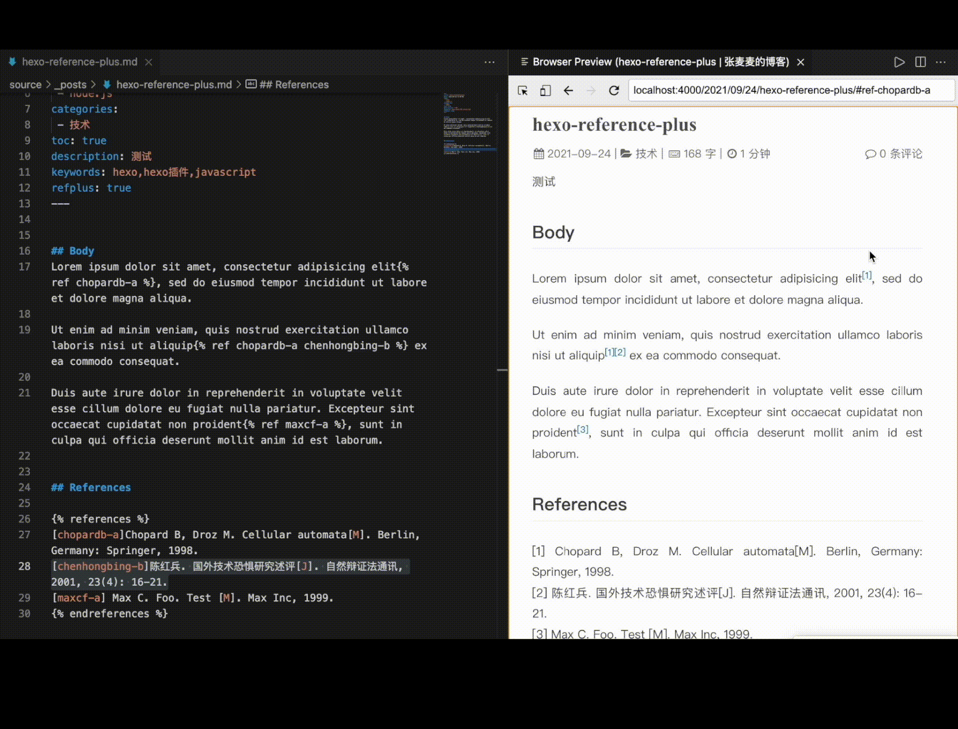 First, set refplus: true in your hexo markdown file's front-matter, like
