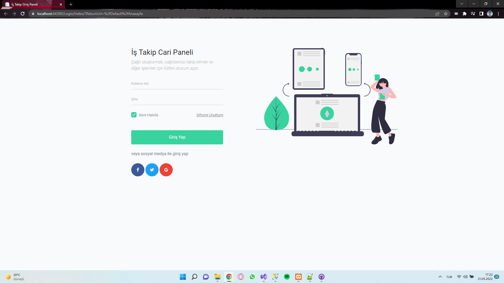 Job Tracking Web Panel MVC5 You can check it desktop application Used Technologies Frontend HTML CSS Bootstrap Javascript jQuery Backend ASP.NET MVC5 Database MS SQL ORM Entity Framework 6 A Few Photos Company Login Page Company Index Company Update Profile Company Active Tasks Company Task Detail Company Open Task Links Course License MIT